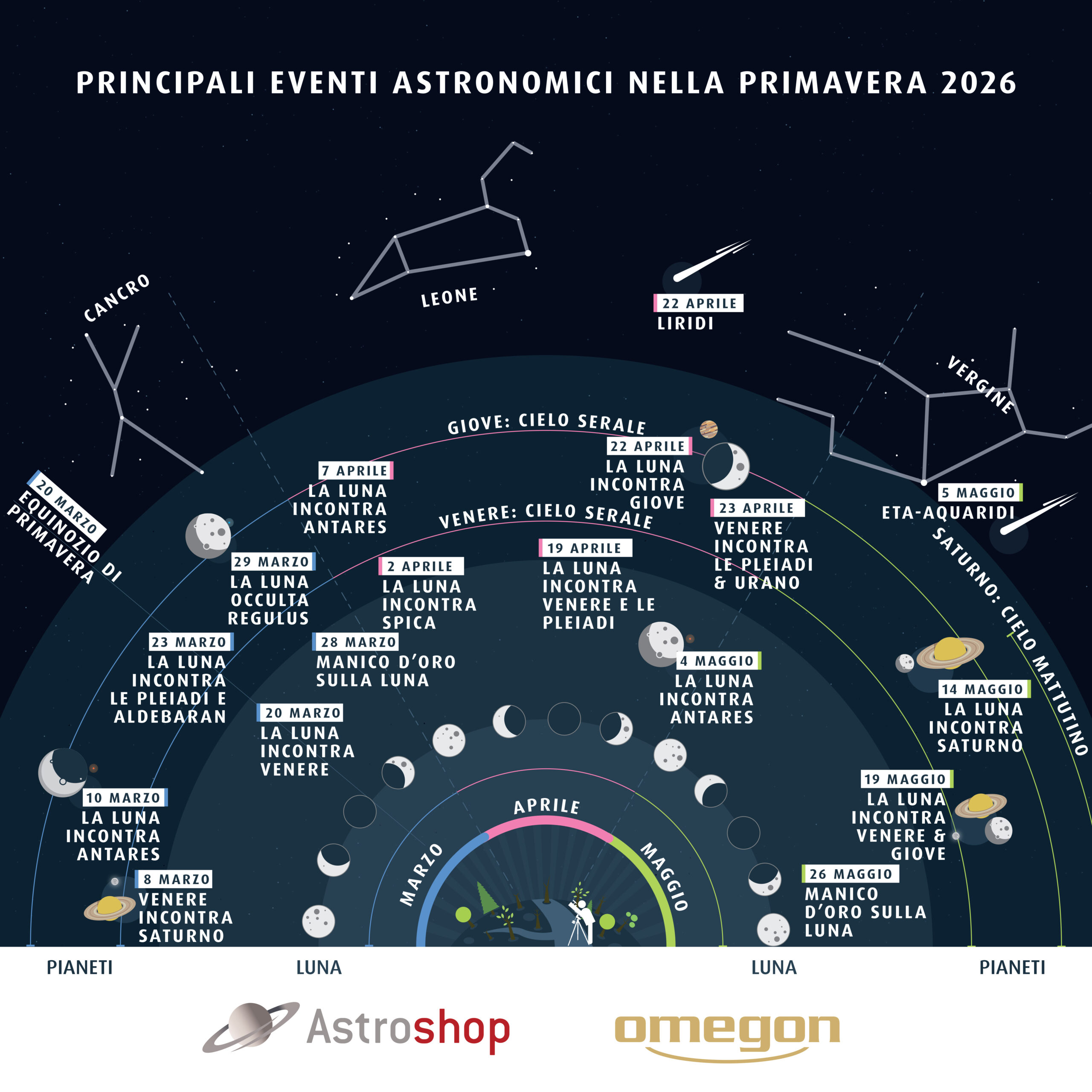 I nostri “Astro Highlights Primavera 2026” vi mostrano tutte le date importanti: il grafico restituisce a colpo d’occhio gli appuntamenti principali, seguiti nel testo da una descrizione dettagliata degli eventi celesti.