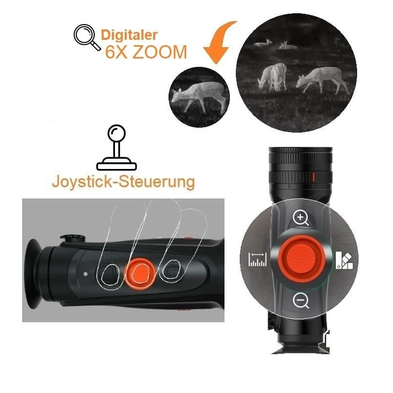 Grazie al sistema Dual Field, gli utenti possono passare rapidamente da un campo visivo ampio a uno ridotto. Dopo aver individuato il bersaglio con l'ingrandimento base più piccolo, è possibile passare all'ingrandimento base più grande per il riconoscimento del bersaglio. Grazie al selettore rotante del sistema Dual Field, la regolazione dell'ingrandimento base avviene in pochi secondi, senza dover regolare nuovamente la messa a fuoco. Questa funzione è assolutamente unica e disponibile solo nella serie ThermTec. Ciò consente una ricerca rapida e un'identificazione precisa. Lo strumento è quindi ideale per la caccia in boschi e campi. - Display AMOLED con 1024x768px