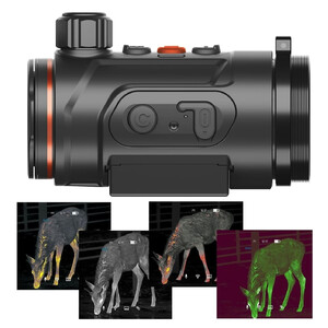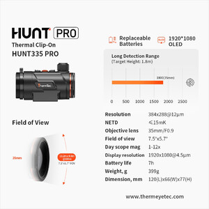 Il Hunt 335 Pro di ThermTec stabilisce nuovi standard nella tecnologia di imaging termico. Questo versatile dispositivo aggiuntivo, il Hunt 335 Pro, può essere montato rapidamente e facilmente sul vostro mirino diurno (adapter disponibile come optional) e trasforma il vostro mirino in un potente visore notturno. Perfetto per esperienze di caccia impegnative, l'Hunt 335 Pro convince per l'ottimo rapporto qualità-prezzo, un sensore ad alta risoluzione da 384x288 Pixel, una lente da 35 mm con messa a fuoco manuale e innovativa rotella di messa a fuoco, una sensibilità ≤ 15 mK, un'impressionante distanza di rilevamento fino a 1.800 metri, un ampio campo visivo di circa 13,1 metri a 100 metri e un sistema di batterie sostituibili con fino a 14 ore di autonomia grazie alla seconda batteria inclusa, che può essere comodamente ricaricata tramite USB-C.
