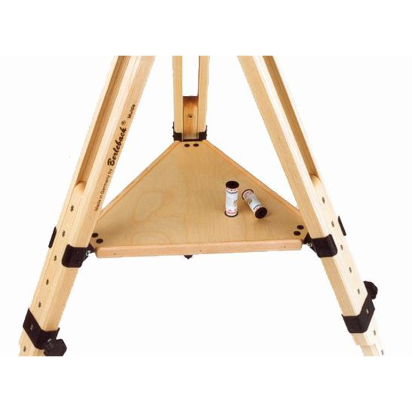 Testa in metallo leggero adatta alle montature GP di Vixen. Le gambe del treppiede non hanno un fermo fisso. Il blocco anti-apertura è garantito da una piastra di appoggio o da una catena in acciaio. Entrambi sono inclusi nella fornitura.