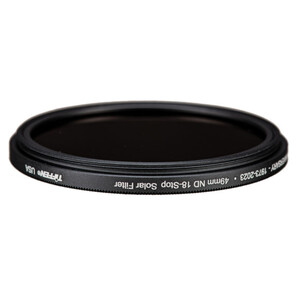 Questo filtro solare a densità neutra di Tiffen, in edizione speciale per il 50° anniversario, è un filtro di alta qualità con un fattore di filtraggio di 262.144x, che riduce l'esposizione di 18 stop. La sua densità di 5,4 oscura l'intera immagine, consentendo di scattare foto con un'apertura maggiore o un tempo di esposizione più lungo, riducendo al contempo il rischio di sovraesposizione. In questo modo è possibile ottenere foto del sole più dettagliate rispetto alle condizioni normali.