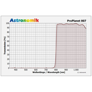 Il filtro ProPlanet IR 807 taglia la parte visibile dello spettro e si apre solo a partire da una lunghezza d'onda di 807 nanometri. In questo modo vengono bloccate le aree della luce particolarmente sensibili al seeing e vengono lasciate passare le aree della luce a onde più lunghe, nettamente meno sensibili al seeing. Questo procedimento riduce visibilmente i problemi di seeing nella fotografia planetaria e lunare, senza compromettere in modo significativo la sensibilità del sensore di imaging.