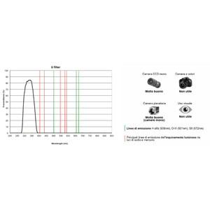 Il nostro filtro UV-Pass lascia passare solo le lunghezze d'onda dove le strutture nuvolose di Venere diventano visibili cioè nell'ultravioletto (tutte le altre lunghezze d'onda vengono invece bloccate). Questo consente di effettuare eccezionali riprese anche con telescopi relativamente piccoli. Il filtro lascia passare la radiazione compresa solo tra i 280nm e i 380nm. L'occhio umano non è sensibile a questa radiazione quindi questo filtro è utilizzabile solo fotograficamente con camere digitali sensibili a questa lunghezze d'onda (generalmente quelle monocromatiche).
