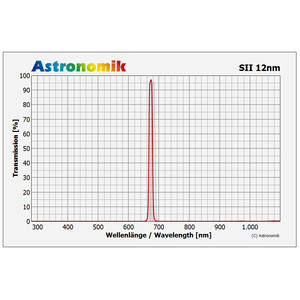 Il filtro Astronomik SII è ideale per la fotografia di nebulose con emissioni di zolfo sia da aree di osservazione inquinate dalla luce che da aree buie. Aumenta notevolmente il contrasto tra gli oggetti che emettono luce a 671,7 nm e 673 nm (linee SII) e lo sfondo del cielo. Il filtro Astronomik SII blocca tutte le linee di emissione delle lampade al sodio e al mercurio ad alta e bassa pressione, i massimi delle tipiche luci a LED, la maggior parte delle linee dell'airglow naturale e la fastidiosa luce lunare. Per risultati particolarmente contrastati, il filtro Astronomik SII è ottimizzato in modo da non lasciar passare la luce H-alpha.