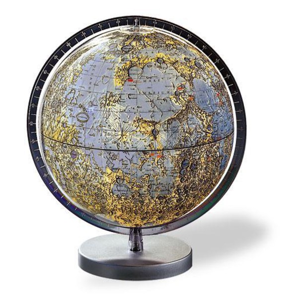 Questo globo di alta qualità in vetro acrilico mostra la superficie fisica della faccia visibile e nascosta della Luna, sia illuminato che spento. È possibile esplorare le differenze di altezza e profondità del paesaggio craterizzato con una plasticità quasi tridimensionale.