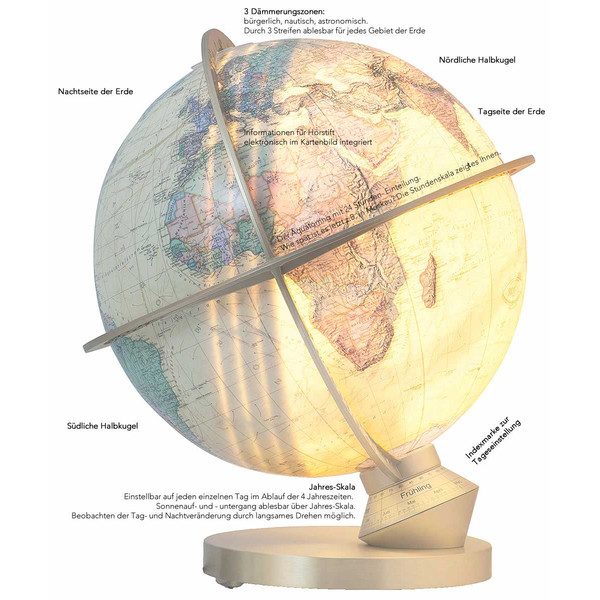 Il globo luminoso PLANET ERDE offre una ricchezza unica di informazioni geografiche e astronomiche: i tipi di movimento della Terra, la sua orbita attorno al Sole in 365 giorni, la rotazione di 24 ore, l'area subsolare, il percorso del Sole tra i tropici, gli orari, l'alba e il tramonto, la scala temporale con divisione in 24 ore, la scala annuale (regolabile su qualsiasi periodo di tempo nell'arco delle 4 stagioni). Con la scala alla base è possibile impostare qualsiasi giorno dell'anno. L'ora per ogni luogo della Terra si legge all'intersezione del rispettivo meridiano con l'equatore sull'anello equatoriale. Illuminato: divisione tra giorno e notte e precisa rappresentazione politica. Non illuminato: rappresentazione della vegetazione geografica della Terra.