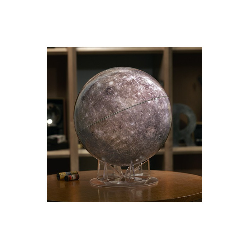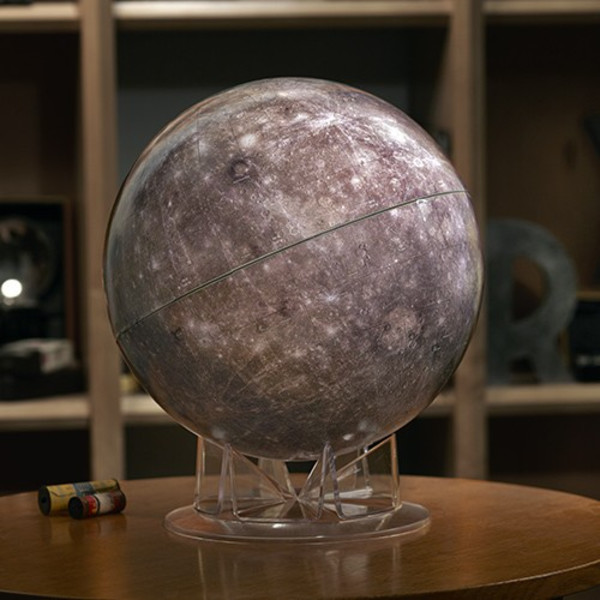 The innermost planet of our solar system remained an enigma until very recently. Mercury orbits the Sun in just 88 days, never spending more than a week or two in view after sunset or before sunrise, and the planet's proximity to the Sun challenged telescopic observers for centuries. But during its mission, which ended in 2015, the NASA spacecraft Messenger revealed a unique world with a complex history. This globe combines data from 18,000 Messenger images, specially processed to preserve the natural light and dark shading of the Mercurian surface. More than 350 craters and other features are labeled on the globe, including names of well-known painters, composers, and writers. Place Mercury, the Roman messenger to the gods, on your desk!