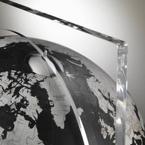 La struttura che sostiene il globo è realizzata in cristallo acrilico, un materiale trasparente e di alta qualità che conferisce a questo oggetto un aspetto originale e moderno. Grazie all'estrema trasparenza della struttura in vetro acrilico, il globo sembra sospeso nell'aria.
