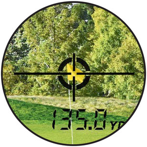Scopri un modo nuovo e facile per segnalare che la distanza dalla bandierina è stata misurata. Immagina la scena di un colpo di avvicinamento al green con un bosco sullo sfondo, dove non sei certo che la distanza misurata sia dalla bandierina o dagli alberi dietro di questa. La tecnologia LOCKED ON visualizza la distanza dal soggetto più vicino, ossia la bandierina, e il simbolo LOCKED ON appare contemporaneamente nel mirino per segnalartelo. È chiaramente visibile che è stata misurata la distanza dalla bandierina anche con gli alberi sullo sfondo.
