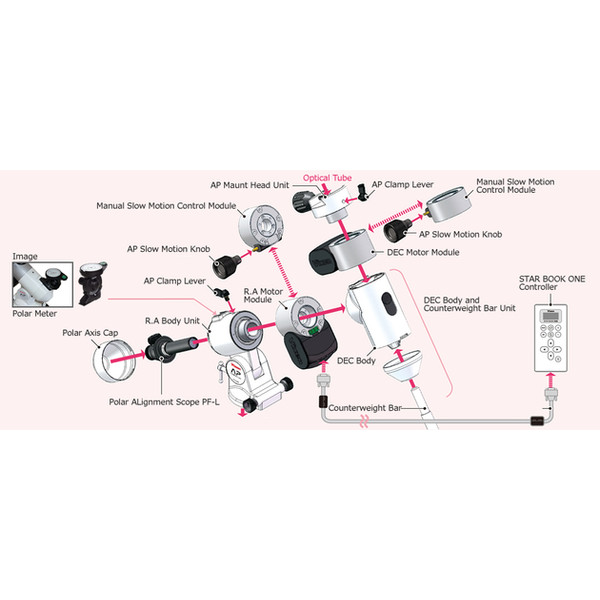 Questo modulo motore sostituisce il controllo del movimento manuale dell'asse di ascensione destra nella montatura Advanced Polaris. La figura a destra illustra questa costruzione modulare della montatura. L'adeguamento è quindi molto semplice e può essere invertito in qualsiasi momento. A differenza di altre montature con motori per l'ascensione retta che si possono montare a posteriori, non è necessario armeggiare con motori e ingranaggi più o meno compatibili. Si ottiene invece un sistema coordinato da un'unica fonte.