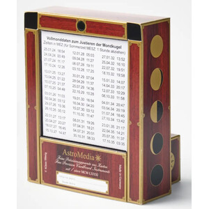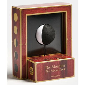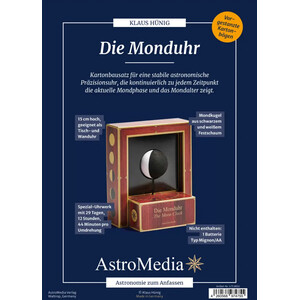 L’orologio lunare di AstroMedia trova sì dei modelli storici nei grandi orologi astronomici del Medioevo, ma come orologio da parete e da tavolo è probabilmente il primo e unico al mondo a mostrare il cambiamento della fase lunare in questo modo. L’assemblaggio di questo kit in cartone con meccanismo speciale è semplice e porta rapidamente a un risultato di grande pregio.