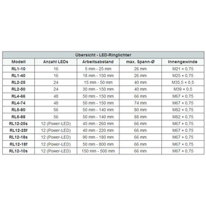 Grazie ai dodici LED da 3 W, la lampada ad anello a LED di potenza RL12 offre un'enorme luminosità ed è adatta per applicazioni con elevati requisiti di illuminazione, ad esempio in combinazione con fotocamere ad alta velocità. Grazie a cinque diverse varianti con geometrie diverse, è possibile trovare l'illuminazione perfetta sia per distanze di lavoro ridotte che per distanze maggiori.
