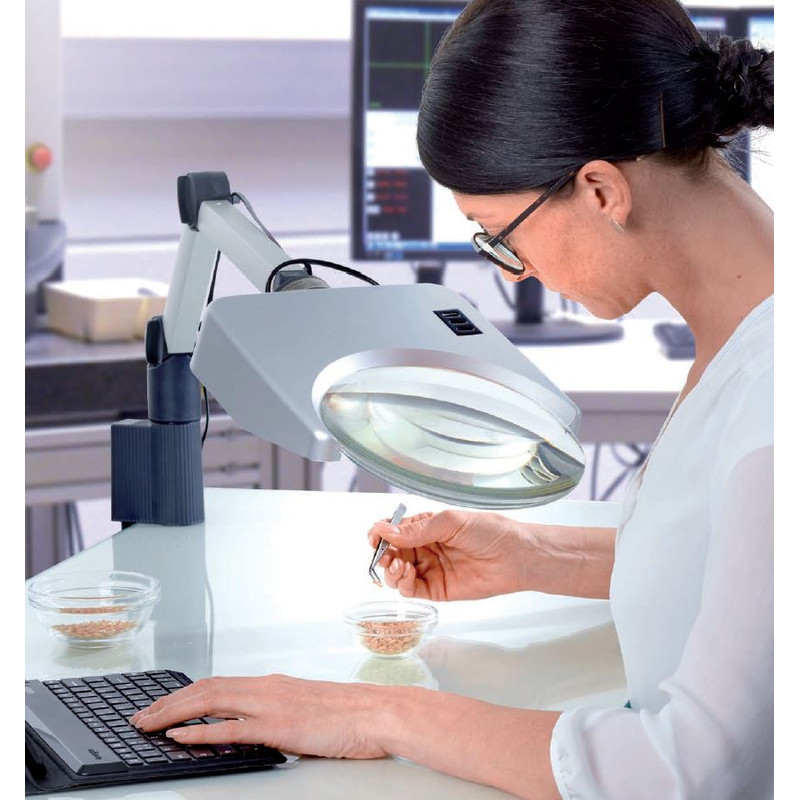 - La nostra serie Tech-Line offre lenti in vetro antigraffio aperte nella parte anteriore che consentono una posizione di lavoro molto confortevole. Ciò è possibile perché il campo visivo non è limitato da un bordo sulla testa della lente (come nelle versioni con illuminazione ad anello). È anche possibile guardare oltre la lente (orientamento ambientale) senza problemi.