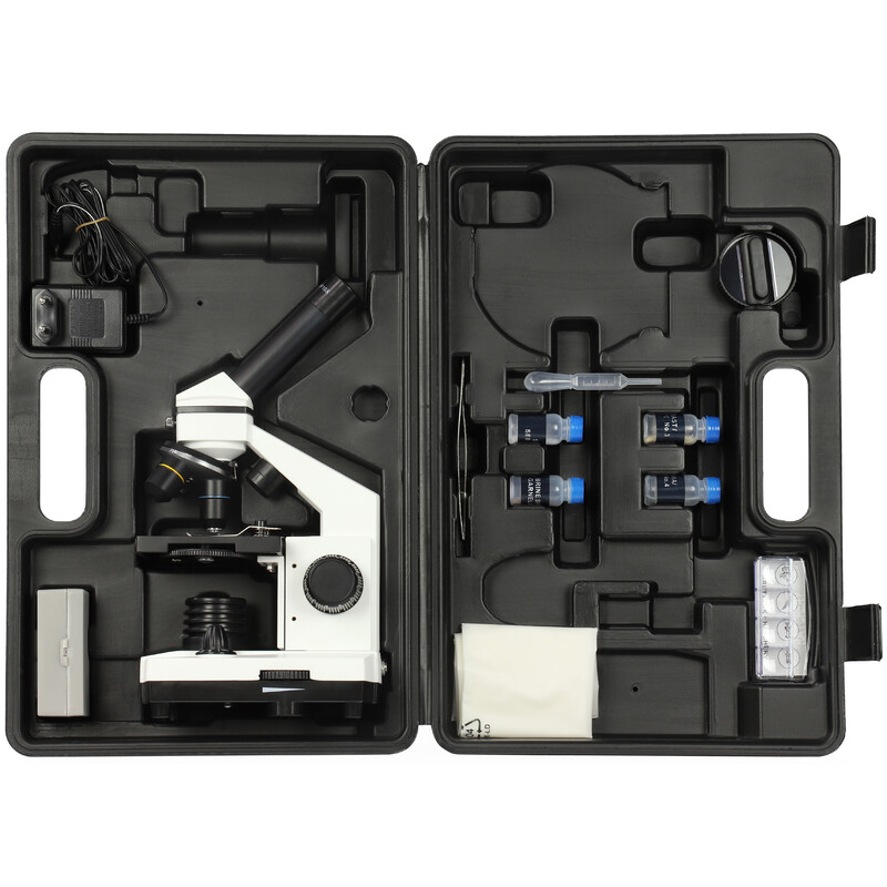 Oppure potete posizionare una preparazione fresca o opaca, prelevata per esempio dal vostro giardino, e metterla letteralmente sotto ai riflettori scegliendo la luce LED incidente. Questo microscopio è adatto anche ai bambini e garantisce divertimento per tutta la famiglia.