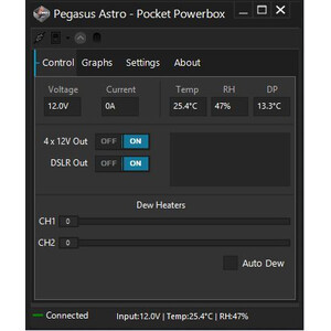 Il Pocket Powerbox Advance è completamente supportato dalla piattaforma ASCOM 6. In combinazione con il programma principale che funge da server, è possibile utilizzare i driver ASCOM 6.4 più recenti per assegnare le impostazioni ambientali al software supportato (ad es. Sequence Generator Pro / MaximDL) (ASCOM ObservingConditions) e per attivare o disattivare tutte le uscite a 12V. (Interruttori ASCOM).