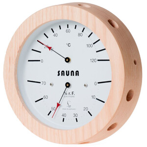 Igrometro sintetico, combinato con termometro bimetallico per misurare l'umidità e la temperatura nella sauna.