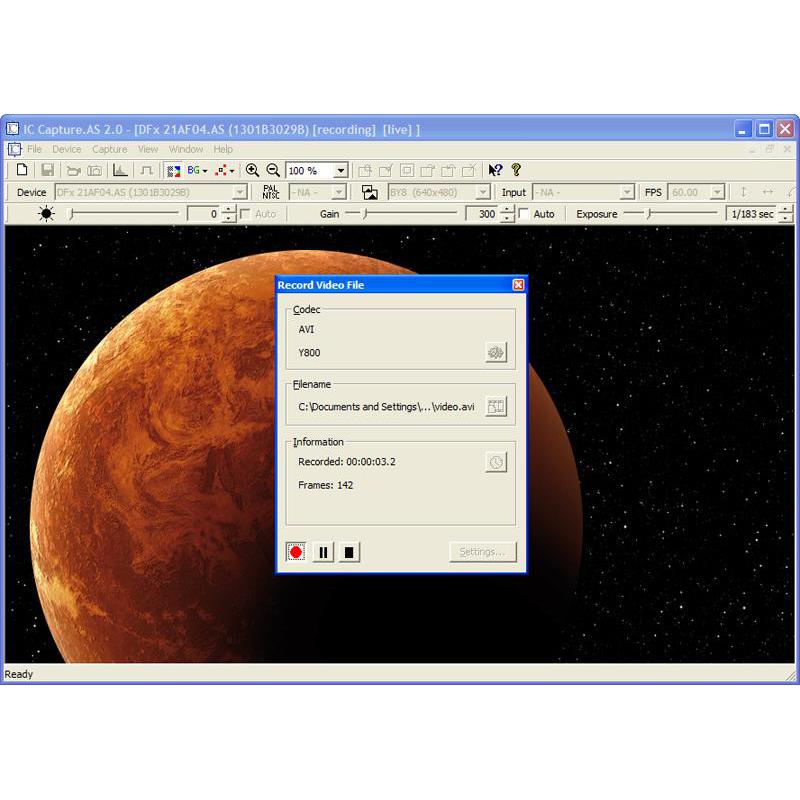 Con un massimo di 60 immagini/s questa telecamera astronomica CCD è ideale per la fotografia astronomica a colori con un alto indice di frequenza di immagini. Utilizzando il software IC Capture.AS potrete memorizzarle, non compresse e senza rischi di perdite, in un file AVI.