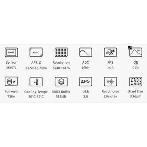 - Alta risoluzione grazie ai pixel da 3,76 µm - ideale per telescopi veloci e nitidi, come Apos, Hyperstar, Celestron Faststar, telescopi Newtoniani ad alta luminosità