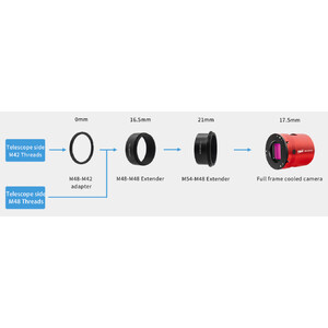 Adattatore di inclinazione: l'ASI4400MC Pro dispone di tre coppie di viti di regolazione per l'inclinazione del sensore. Ogni coppia è composta da una vite di pressione e una di trazione, che consentono di regolare con precisione l'allineamento del sensore rispetto all'asse ottico del telescopio. Questa regolazione aiuta a correggere anche lievi inclinazioni che possono causare la distorsione o la sfocatura delle stelle ai bordi dell'immagine. Ciò garantisce una messa a fuoco nitida e uniforme su tutta l'immagine.