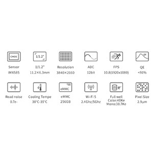 La ASI 585M Pro è dotata di un sensore moderno con 3840 x 2160 pixel. Il sensore Sony IMX585 convince soprattutto per l'alta risoluzione (2,9 µm Pixel), l'elevata frequenza di fotogrammi e la totale assenza del fastidioso effetto di amplificazione (Amp-Glow). Ciò rende questa fotocamera ideale non solo per i pianeti, il sole e la luna, ma anche per la fotografia DeepSky. Il sensore è sufficientemente ampio per molti oggetti DeepSky e nella maggior parte dei casi non è necessario un correttore. La fotocamera è particolarmente adatta per: