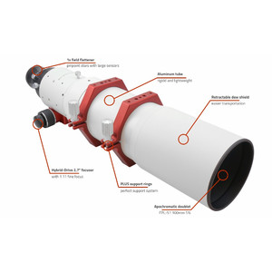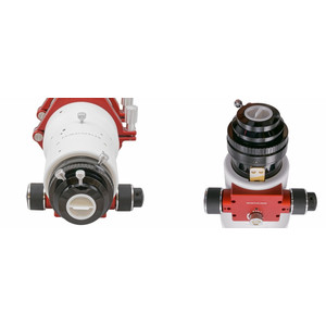 Questo rifrattore incolore (lente FPL-53) è ideale per fotografare oggetti celesti estesi utilizzando fotocamere con un sensore grande (ad esempio, DSLR). Questo include anche le fotocamere reflex full-frame, cioè con sensori più grandi del formato APS-C. Grazie al lungo percorso di messa a fuoco del focheggiatore di 95 mm, questo telescopio rifrattore può essere utilizzato anche in visuale.