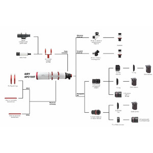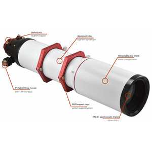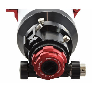 - Focheggiatore Hybrid-Drive con grande apertura e riduzione 1:11. L'azionamento ibrido è meccanicamente superiore al focheggiatore. Inoltre, supporta in modo permanente le pesanti attrezzature della fotocamera senza scivolare. Può essere fissato in una posizione con una vite di bloccaggio. La lunga corsa di messa a fuoco consente un'ampia gamma di opzioni di adattamento. Può fissare una fotocamera direttamente utilizzando l'appiattitore opzionale (T2 o M48). Naturalmente, può anche utilizzare accessori con ricettacoli. A questo scopo, l'Apo è dotato del sistema OnAxisLock.