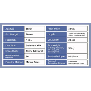 Con la sua elevata luminosità di f/4,66 e l'elemento di correzione del campo integrato, l'HOPE D60 è un vero Astrograph e offre un campo visivo ampio e corretto senza accessori aggiuntivi. Un focheggiatore con riduzione e attacchi filettati versatili facilitano l'installazione e consentono agli utenti avanzati un controllo preciso durante la ripresa di galassie, nebulose e campi stellari.