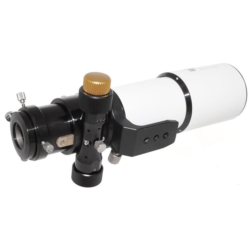 L'obiettivo con spazio d'aria è naturalmente montato in modo regolabile. Ogni lente è dotata della migliore multirivestimento possibile del produttore per il massimo contrasto. Il focheggiatore manuale può sostenere accessori fino a circa 5 chilogrammi senza inclinarsi. La regolazione del tubo di estrazione avviene tramite una cremagliera. È disaccoppiata dal supporto stesso. Ciò consente una regolazione sensibile anche con il carico massimo. La micro-riduzione 1:11 offre una regolazione precisa anche per l'astrofotografia. Una filettatura interna M54x0,75 sul tubo di estrazione consente anche collegamenti a vite.