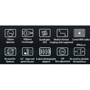 L'FF130 viene fornito con un tappo anticondensa estraibile, un tubo di alta qualità lavorato a CNC e parti decorative. L'OTA pesa 10,5 kg, mentre il pacchetto completo con anelli di sostegno e binario Losmandy pesa 12,5 kg. Il robusto focheggiatore manuale da 3,4" è dotato di un rotatore a 360° e di un attacco per cercatore. Sono inclusi anche adattatori per fotocamera M86, M68, M54 e M48. L'adattatore M48 ha una filettatura interna per l'installazione di filtri da 2".