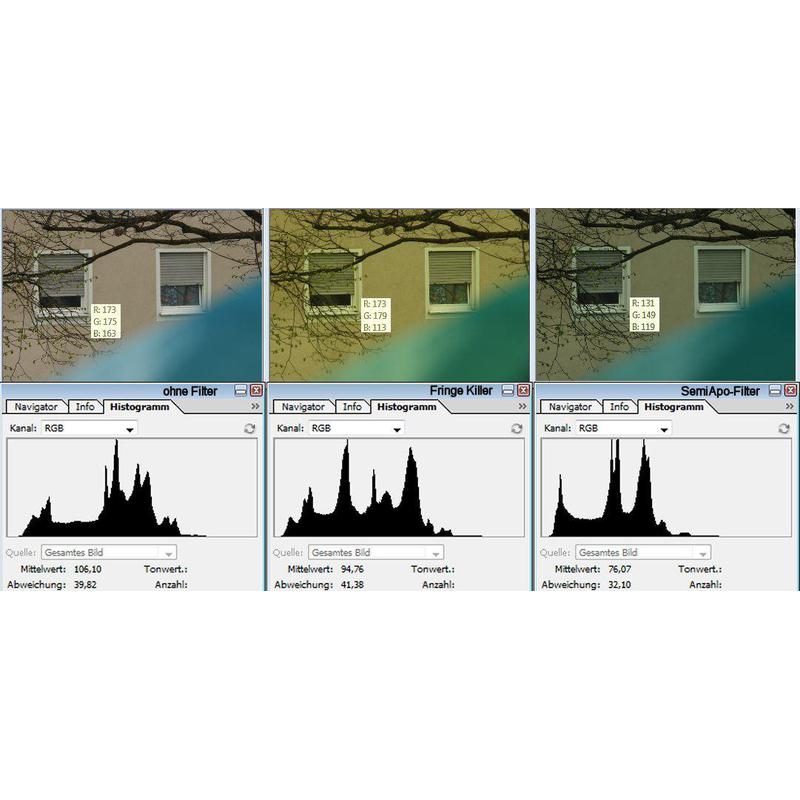 Il Semi-Apo blocca più del 25% della luce blu e rossa. Nel verde la percentuale è inferiore, ma comunque si perde circa il 30% della luce su tutto lo spettro. In compenso i colori tornano neutri, tranne che per una leggera dominante verde. Dal punto di vista fotografico, il filtro Semi-Apo costa circa mezzo diaframma.