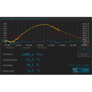 Applicazione in astronomia: le moderne montature di fascia alta necessitano di accedere a dati meteorologici aggiornati per compensare correttamente l'influenza della rifrazione atmosferica. I dati devono essere rilevati in loco e influenzano sia il posizionamento che l'inseguimento. Per i telescopi installati in modo permanente in un osservatorio, offriamo stazioni meteo, che tuttavia non sono progettate per l'uso mobile. La stazione meteo USB Blue Astro può essere utilizzata in modo flessibile, sia in modo mobile che fisso.