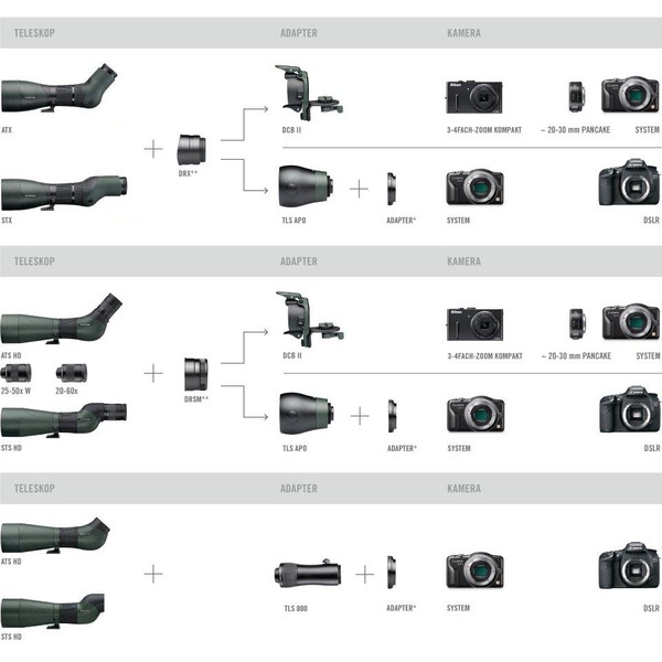L'innovativa modularità offre inaspettate opportunità a prescindere dalle preferenze personali o dalle situazioni. Con l'aiuto di esperti del settore è stato sviluppato un adattatore per Digiscoping che apre le porte ad un nuovo mondo della visione. Studiato fin nei minimi dettagli per rendervi attrezzati al meglio in ogni situazione.